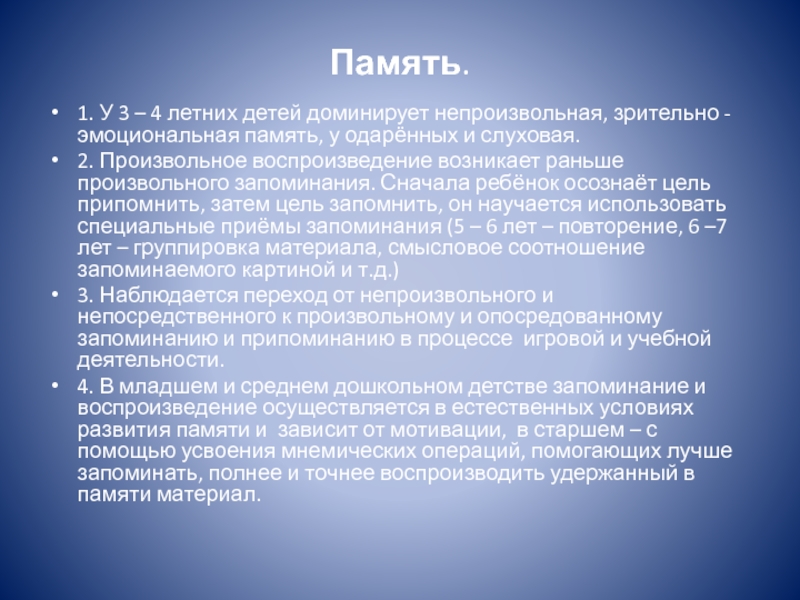 1. У 3 – 4 летних детей доминирует непроизвольная, зрительно