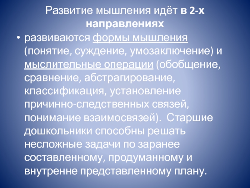 и мыслительные операции (обобщение, сравнение, абстрагирование, классификация, установление причинно-следственных связей, понимание взаимосвязей). Старшие дошкольники способны решать несложные задачи по заранее составленному, продуманному и внутренне представленному плану.