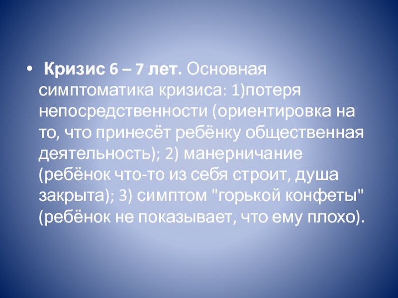 Слайд 12 Кризис 6 – 7 лет. Основная симптоматика кризиса: 1)потеря непосредственности (ориентировка