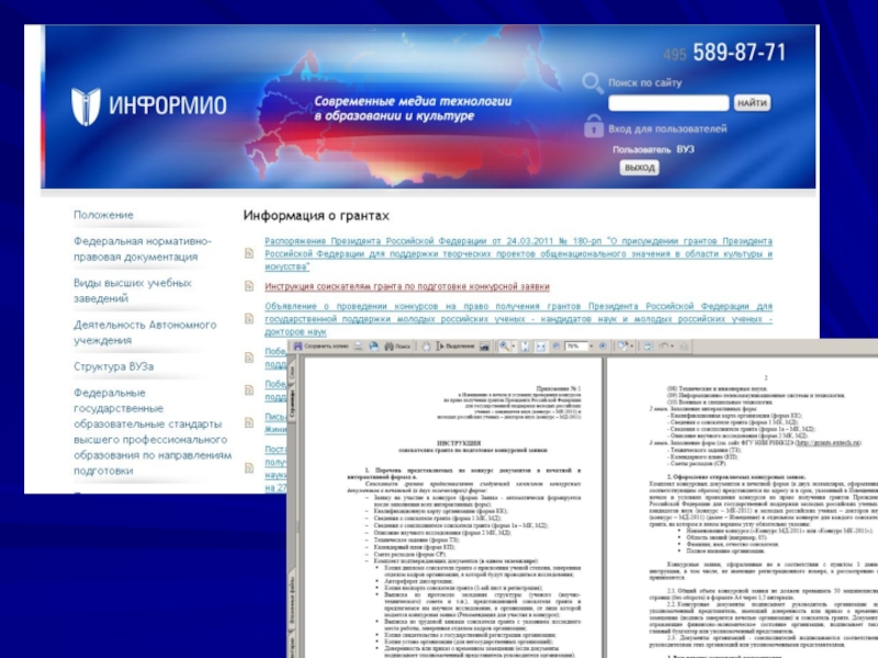 «Информио» – всероссийская отраслевая программная оболочка, созданная, прежде всего для руководителей органов управления образованием, руководителей образовательных учреждений ВПО. Программа представляет собой информационный справочник с подборкой различных материалов, благодаря которой, вы имеете возможность получать тексты последних приказов, писем, положений, инструкций, касающихся вопросов образования.