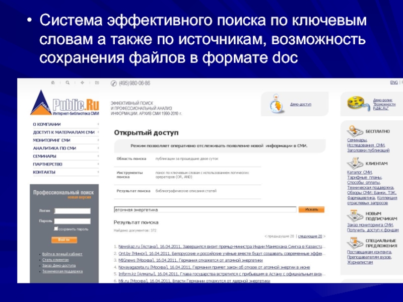 Слайд 21Система эффективного поиска по ключевым словам а также по источникам, возможность