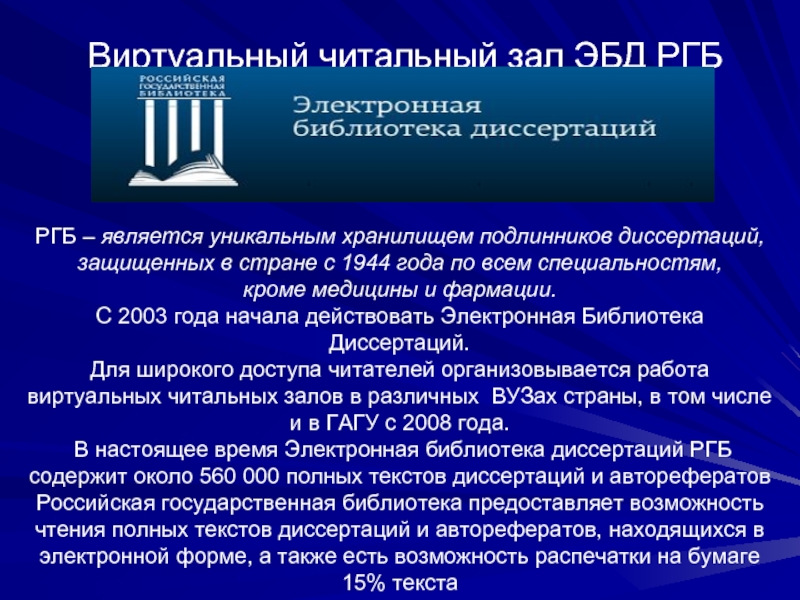 Слайд 5 Виртуальный читальный зал ЭБД РГБ