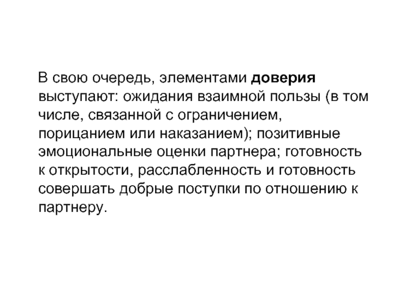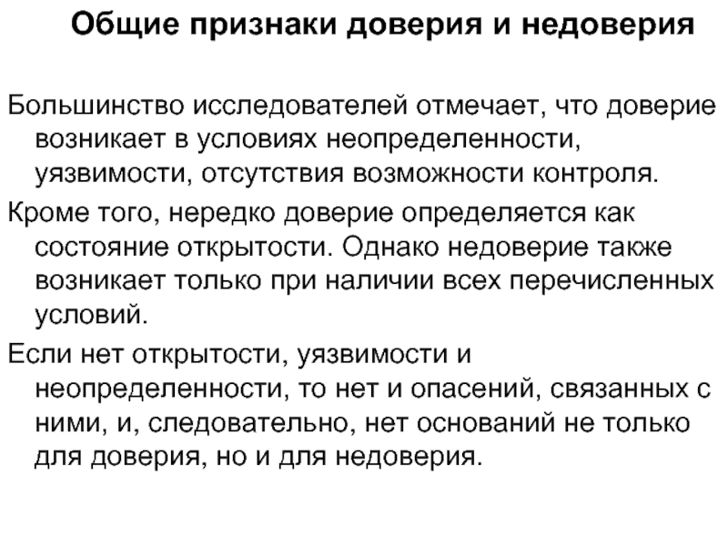 Кроме того, нередко доверие определяется как состояние открытости. Однако недоверие также возникает только при наличии всех перечисленных условий.