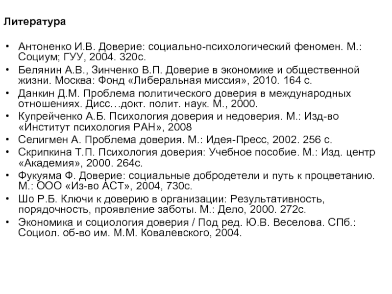 Антоненко И.В. Доверие: социально-психологический феномен. М.: Социум; ГУУ, 2004. 320с.