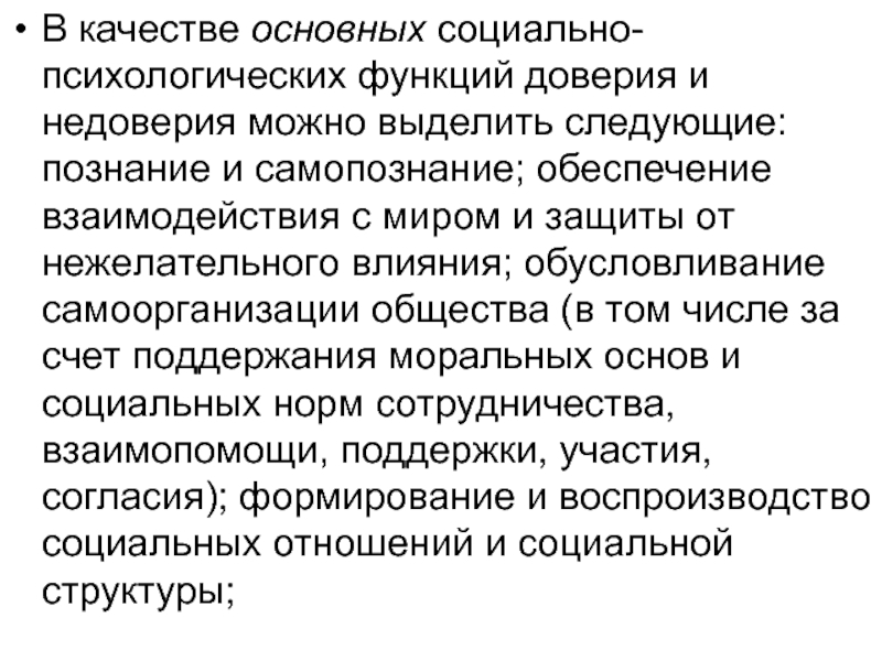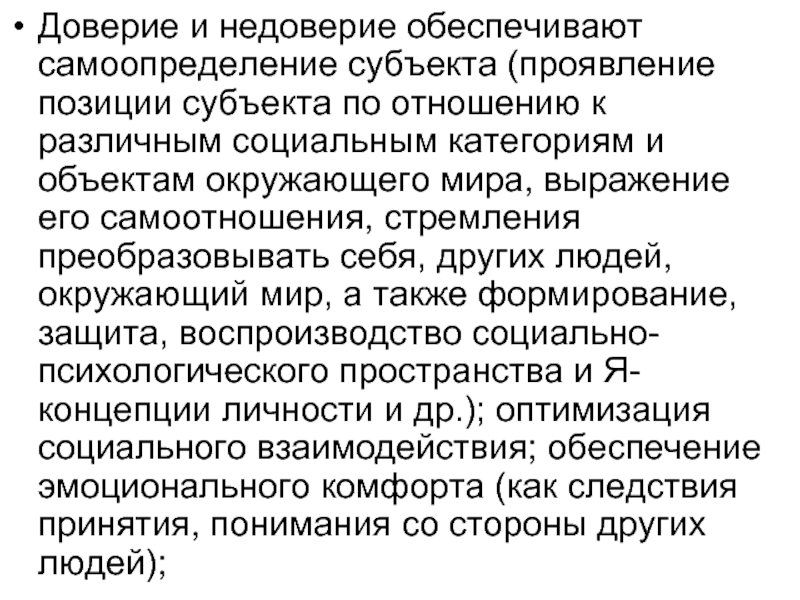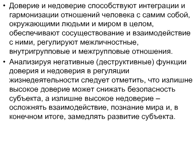 Анализируя негативные (деструктивные) функции доверия и недоверия в регуляции жизнедеятельности следует отметить, что излишне высокое доверие может снижать безопасность субъекта, а излишне высокое недоверие – осложнять взаимодействие, познание мира и, в конечном итоге, замедлять развитие субъекта.