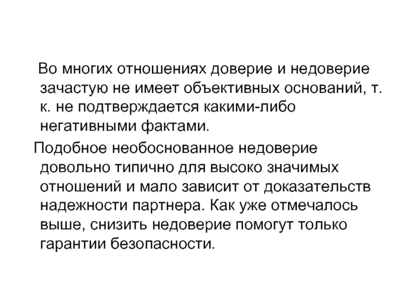 Подобное необоснованное недоверие довольно типично для высоко значимых отношений и мало зависит от доказательств надежности партнера. Как уже отмечалось выше, снизить недоверие помогут только гарантии безопасности.