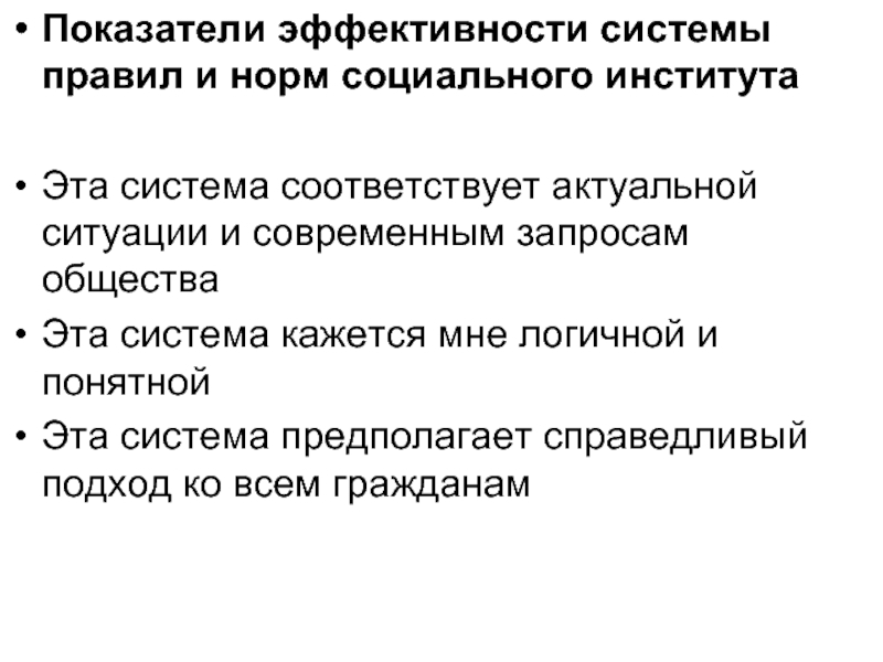Слайд 37Показатели эффективности системы правил и норм социального института