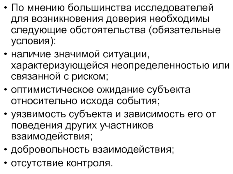 Слайд 6По мнению большинства исследователей для возникновения доверия необходимы следующие обстоятельства (обязательные