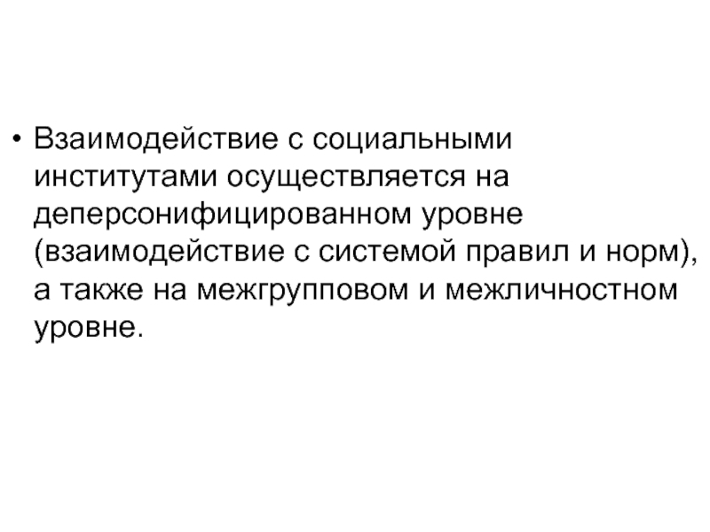 Слайд 36Взаимодействие с социальными институтами осуществляется на деперсонифицированном уровне (взаимодействие с системой