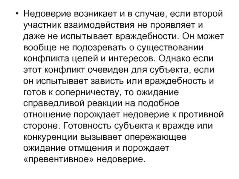 и даже не испытывает враждебности. Он может вообще не подозревать о существовании конфликта целей и интересов. Однако если этот конфликт очевиден для субъекта, если он испытывает зависть или враждебность и готов к соперничеству, то ожидание справедливой реакции на подобное отношение порождает недоверие к противной стороне. Готовность субъекта к вражде или конкуренции вызывает опережающее ожидание отмщения и порождает «превентивное» недоверие.