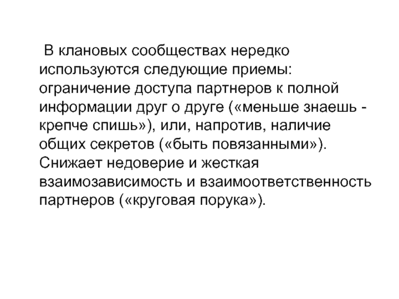 Слайд 34 В клановых сообществах нередко используются следующие приемы: ограничение доступа