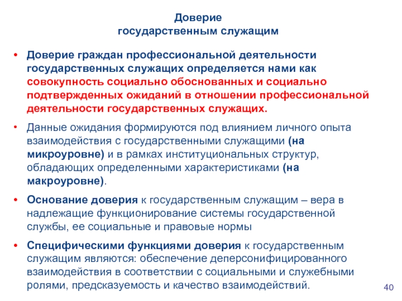 Специфическими функциями доверия к государственным служащим являются: обеспечение деперсонифицированного взаимодействия в соответствии с социальными и служебными ролями, предсказуемость и качество взаимодействий.