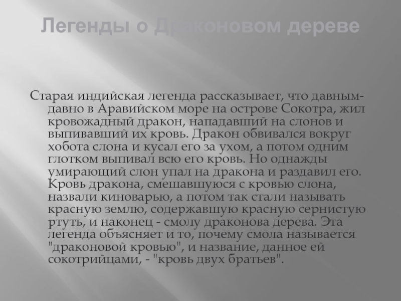 море на острове Сокотра, жил кровожадный дракон, нападавший на слонов и выпивавший их кровь. Дракон обвивался вокруг хобота слона и кусал его за ухом, а потом одним глотком выпивал всю его кровь. Но однажды умирающий слон упал на дракона и раздавил его. Кровь дракона, смешавшуюся с кровью слона, назвали киноварью, а потом так стали называть красную землю, содержавшую красную сернистую ртуть, и наконец - смолу драконова дерева. Эта легенда объясняет и то, почему смола называется "драконовой кровью", и название, данное ей сокотрийцами, - "кровь двух братьев".