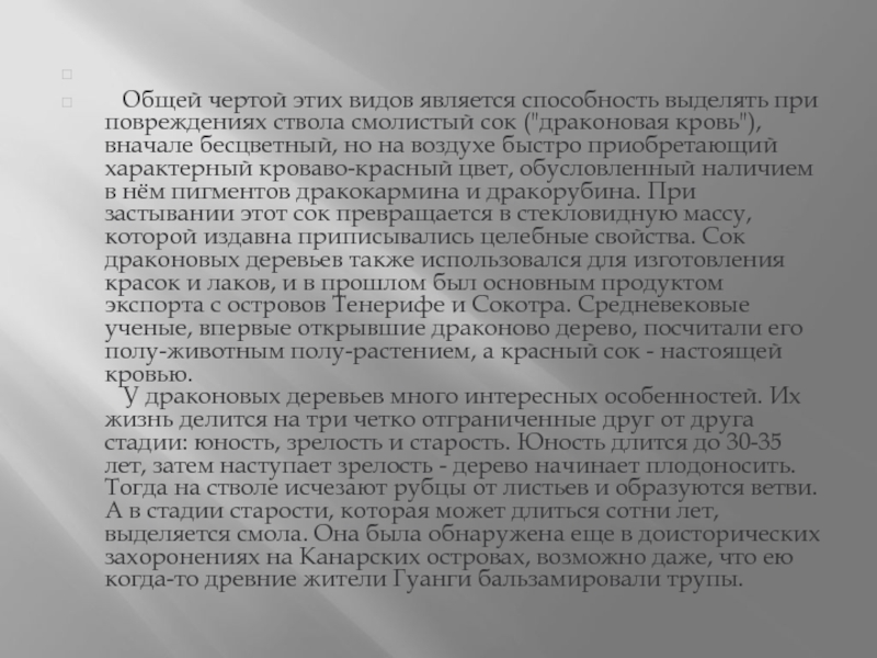 У драконовых деревьев много интересных особенностей. Их жизнь делится на три четко отграниченные друг от друга стадии: юность, зрелость и старость. Юность длится до 30-35 лет, затем наступает зрелость - дерево начинает плодоносить. Тогда на стволе исчезают рубцы от листьев и образуются ветви. А в стадии старости, которая может длиться сотни лет, выделяется смола. Она была обнаружена еще в доисторических захоронениях на Канарских островах, возможно даже, что ею когда-то древние жители Гуанги бальзамировали трупы.