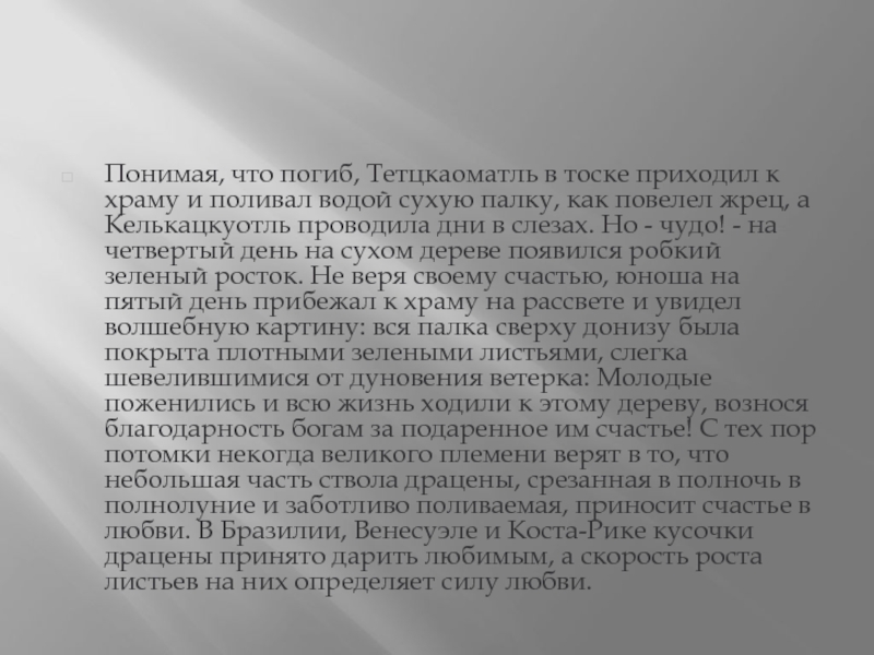 водой сухую палку, как повелел жрец, а Келькацкуотль проводила дни в слезах. Но - чудо! - на четвертый день на сухом дереве появился робкий зеленый росток. Не веря своему счастью, юноша на пятый день прибежал к храму на рассвете и увидел волшебную картину: вся палка сверху донизу была покрыта плотными зелеными листьями, слегка шевелившимися от дуновения ветерка: Молодые поженились и всю жизнь ходили к этому дереву, вознося благодарность богам за подаренное им счастье! С тех пор потомки некогда великого племени верят в то, что небольшая часть ствола драцены, срезанная в полночь в полнолуние и заботливо поливаемая, приносит счастье в любви. В Бразилии, Венесуэле и Коста-Рике кусочки драцены принято дарить любимым, а скорость роста листьев на них определяет силу любви.