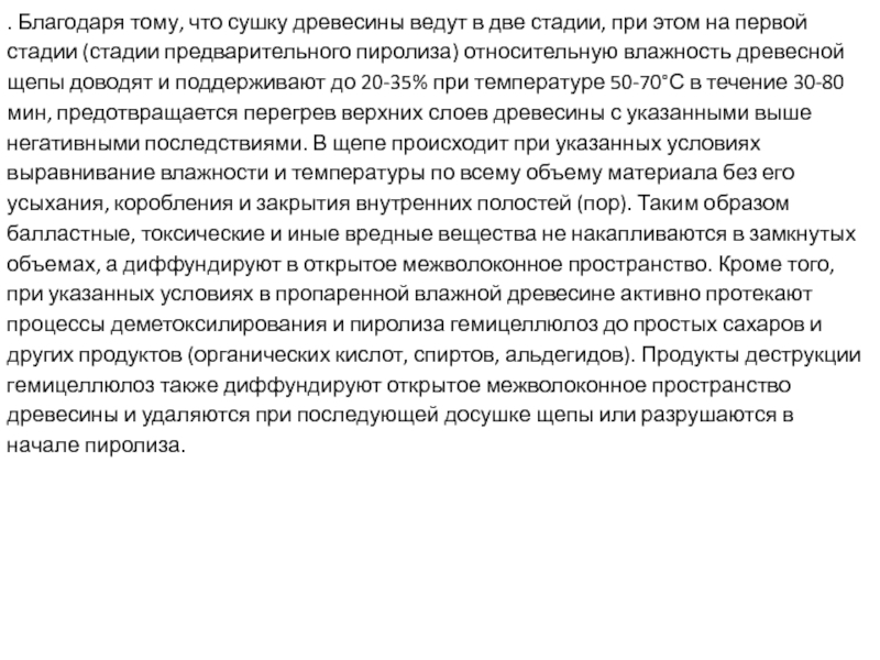 этом на первой стадии (стадии предварительного пиролиза) относительную влажность древесной щепы доводят и поддерживают до 20-35% при температуре 50-70°С в течение 30-80 мин, предотвращается перегрев верхних слоев древесины с указанными выше негативными последствиями. В щепе происходит при указанных условиях выравнивание влажности и температуры по всему объему материала без его усыхания, коробления и закрытия внутренних полостей (пор). Таким образом балластные, токсические и иные вредные вещества не накапливаются в замкнутых объемах, а диффундируют в открытое межволоконное пространство. Кроме того, при указанных условиях в пропаренной влажной древесине активно протекают процессы деметоксилирования и пиролиза гемицеллюлоз до простых сахаров и других продуктов (органических кислот, спиртов, альдегидов). Продукты деструкции гемицеллюлоз также диффундируют открытое межволоконное пространство древесины и удаляются при последующей досушке щепы или разрушаются в начале пиролиза.