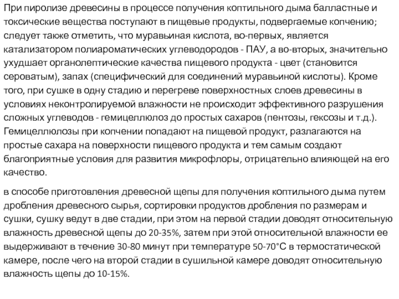 вещества поступают в пищевые продукты, подвергаемые копчению; следует также отметить, что муравьиная кислота, во-первых, является катализатором полиароматических углеводородов - ПАУ, а во-вторых, значительно ухудшает органолептические качества пищевого продукта - цвет (становится сероватым), запах (специфический для соединений муравьиной кислоты). Кроме того, при сушке в одну стадию и перегреве поверхностных слоев древесины в условиях неконтролируемой влажности не происходит эффективного разрушения сложных углеводов - гемицеллюлоз до простых сахаров (пентозы, гексозы и т.д.). Гемицеллюлозы при копчении попадают на пищевой продукт, разлагаются на простые сахара на поверхности пищевого продукта и тем самым создают благоприятные условия для развития микрофлоры, отрицательно влияющей на его качество.