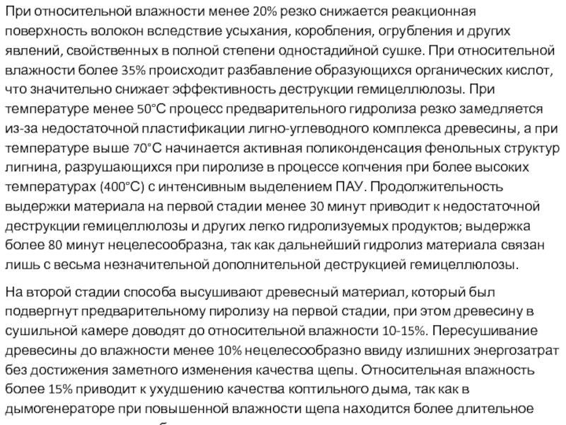 усыхания, коробления, огрубления и других явлений, свойственных в полной степени одностадийной сушке. При относительной влажности более 35% происходит разбавление образующихся органических кислот, что значительно снижает эффективность деструкции гемицеллюлозы. При температуре менее 50°С процесс предварительного гидролиза резко замедляется из-за недостаточной пластификации лигно-углеводного комплекса древесины, а при температуре выше 70°С начинается активная поликонденсация фенольных структур лигнина, разрушающихся при пиролизе в процессе копчения при более высоких температурах (400°С) с интенсивным выделением ПАУ. Продолжительность выдержки материала на первой стадии менее 30 минут приводит к недостаточной деструкции гемицеллюлозы и других легко гидролизуемых продуктов; выдержка более 80 минут нецелесообразна, так как дальнейший гидролиз материала связан лишь с весьма незначительной дополнительной деструкцией гемицеллюлозы.