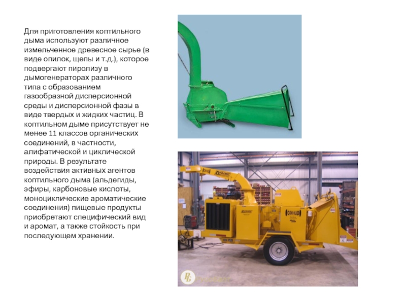 опилок, щепы и т.д.), которое подвергают пиролизу в дымогенераторах различного типа с образованием газообразной дисперсионной среды и дисперсионной фазы в виде твердых и жидких частиц. В коптильном дыме присутствует не менее 11 классов органических соединений, в частности, алифатической и циклической природы. В результате воздействия активных агентов коптильного дыма (альдегиды, эфиры, карбоновые кислоты, моноциклические ароматические соединения) пищевые продукты приобретают специфический вид и аромат, а также стойкость при последующем хранении.