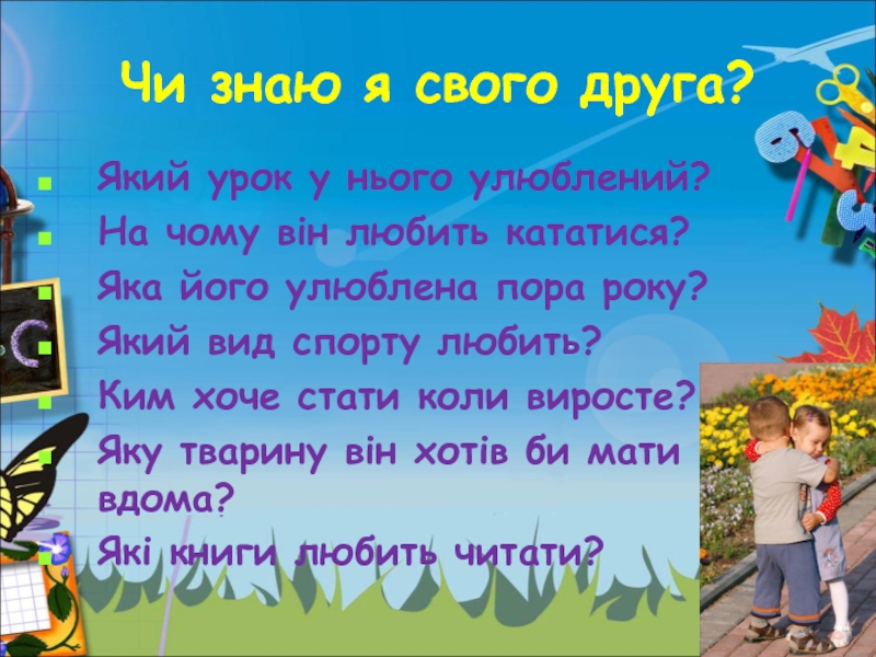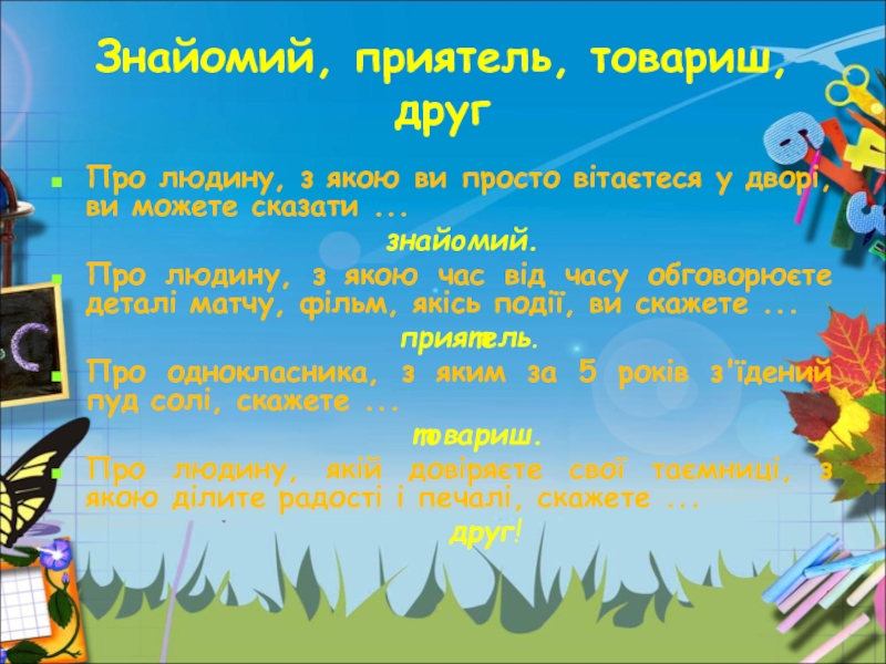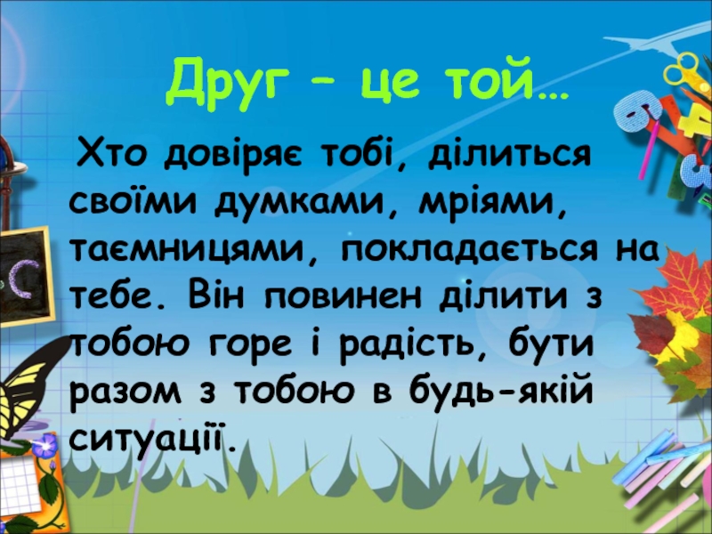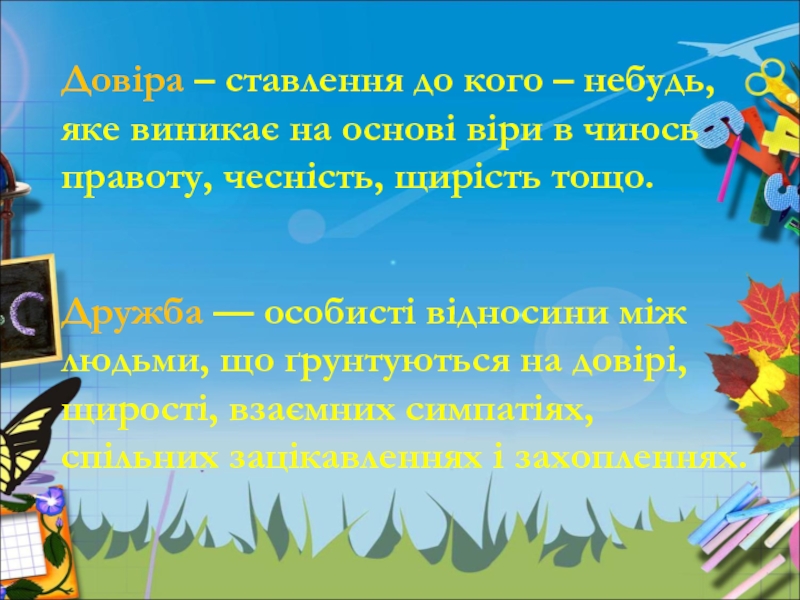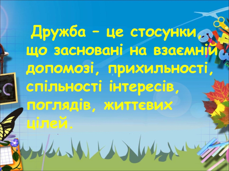Дружба — особисті відносини між людьми, що ґрунтуються на довірі, щирості, взаємних симпатіях, спільних зацікавленнях і захопленнях.