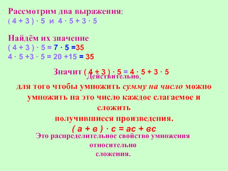 Значит ( 4 + 3 ) · 5 = 4 · 5 + 3 · 5