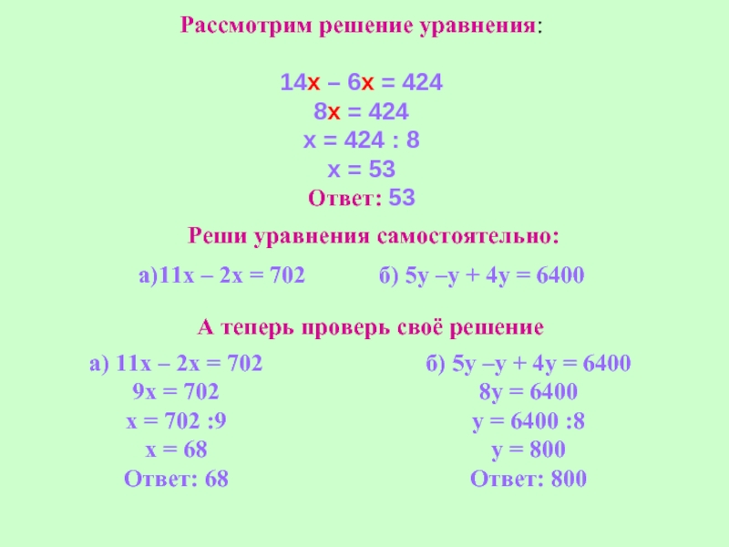 а)11х – 2х = 702 б) 5у –у + 4у = 6400