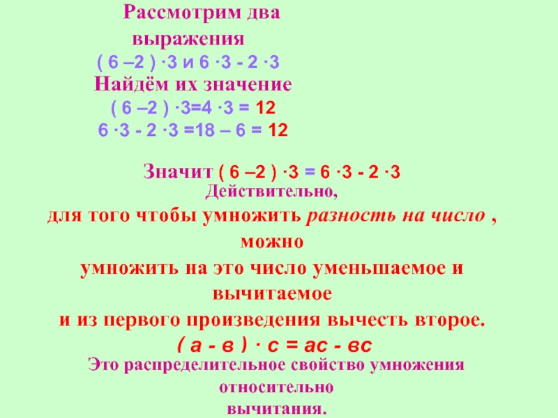 Значит ( 6 –2 ) ·3 = 6 ·3 - 2 ·3