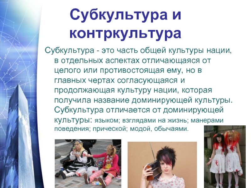 отдельных аспектах отличающаяся от целого или противостоящая ему, но в главных чертах согласующаяся и продолжающая культуру нации, которая получила название доминирующей культуры. Субкультура отличается от доминирующей культуры: языком; взглядами на жизнь; манерами поведения; прической; модой, обычаями.