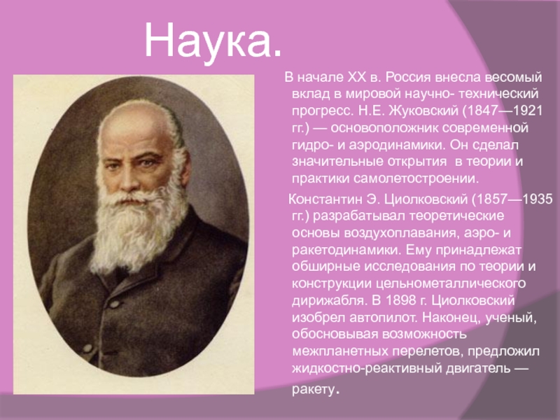 XX в. Россия внесла весомый вклад в мировой научно- технический прогресс. Н.Е. Жуковский (1847—1921 гг.) — основоположник современной гидро- и аэродинамики. Он сделал значительные открытия в теории и практики самолетостроении.