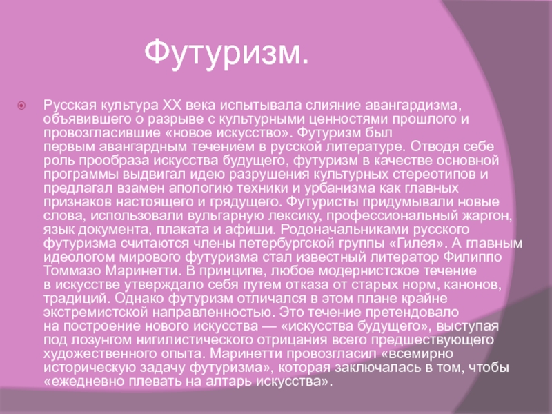 века испытывала слияние авангардизма, объявившего о разрыве с культурными ценностями прошлого и провозгласившие «новое искусство». Футуризм был первым авангардным течением в русской литературе. Отводя себе роль прообраза искусства будущего, футуризм в качестве основной программы выдвигал идею разрушения культурных стереотипов и предлагал взамен апологию техники и урбанизма как главных признаков настоящего и грядущего. Футуристы придумывали новые слова, использовали вульгарную лексику, профессиональный жаргон, язык документа, плаката и афиши. Родоначальниками русского футуризма считаются члены петербургской группы «Гилея». А главным идеологом мирового футуризма стал известный литератор Филиппо Томмазо Маринетти. В принципе, любое модернистское течение в искусстве утверждало себя путем отказа от старых норм, канонов, традиций. Однако футуризм отличался в этом плане крайне экстремистской направленностью. Это течение претендовало на построение нового искусства — «искусства будущего», выступая под лозунгом нигилистического отрицания всего предшествующего художественного опыта. Маринетти провозгласил «всемирно историческую задачу футуризма», которая заключалась в том, чтобы «ежедневно плевать на алтарь искусства».