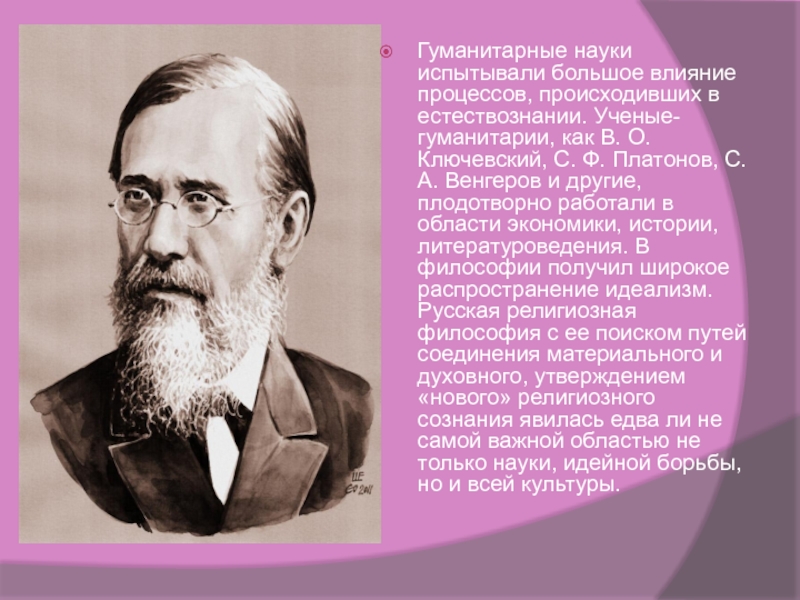 В. О. Ключевский, С. Ф. Платонов, С. А. Венгеров и другие, плодотворно работали в области экономики, истории, литературоведения. В философии получил широкое распространение идеализм. Русская религиозная философия с ее поиском путей соединения материального и духовного, утверждением «нового» религиозного сознания явилась едва ли не самой важной областью не только науки, идейной борьбы, но и всей культуры.