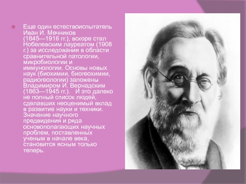 Слайд 8Еще один естествоиспытатель Иван И. Мечников (1845—1916 гг.), вскоре стал Нобелевским