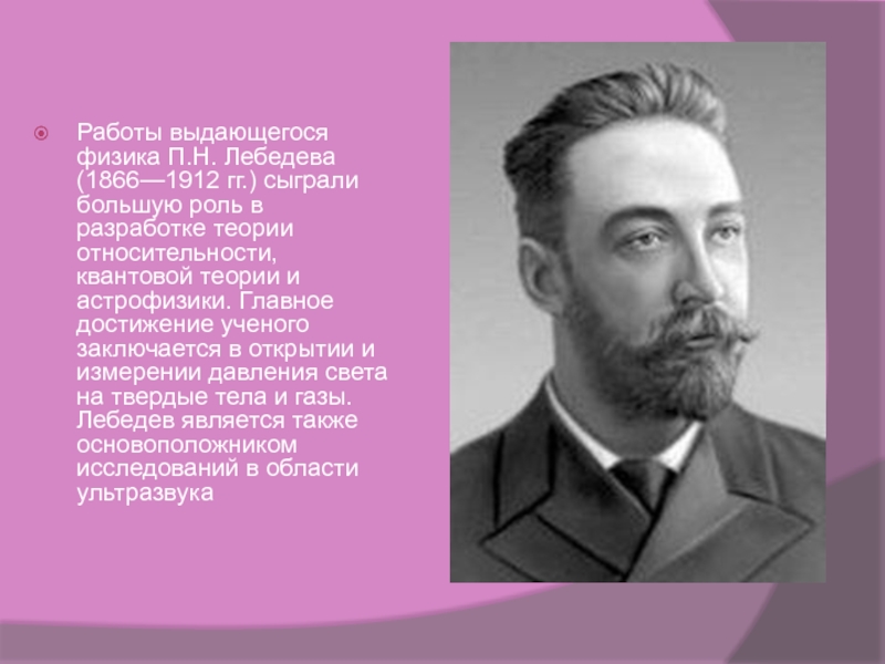 разработке теории относительности, квантовой теории и астрофизики. Главное достижение ученого заключается в открытии и измерении давления света на твердые тела и газы. Лебедев является также основоположником исследований в области ультразвука