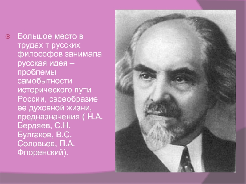 проблемы самобытности исторического пути России, своеобразие ее духовной жизни, предназначения ( Н.А. Бердяев, С.Н. Булгаков, В.С. Соловьев, П.А. Флоренский).