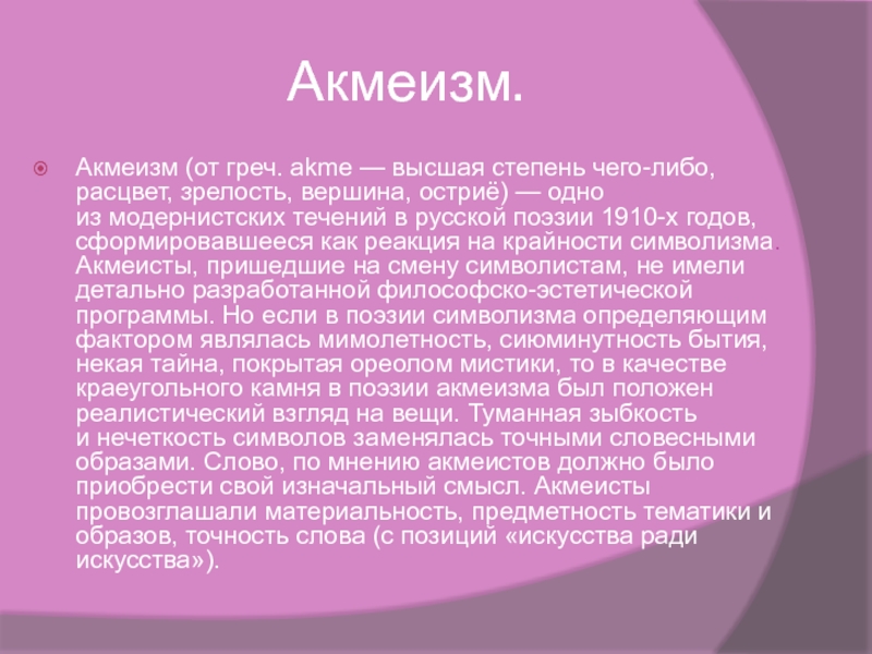 akme — высшая степень чего-либо, расцвет, зрелость, вершина, остриё) — одно из модернистских течений в русской поэзии 1910-х годов, сформировавшееся как реакция на крайности символизма. Акмеисты, пришедшие на смену символистам, не имели детально разработанной философско-эстетической программы. Но если в поэзии символизма определяющим фактором являлась мимолетность, сиюминутность бытия, некая тайна, покрытая ореолом мистики, то в качестве краеугольного камня в поэзии акмеизма был положен реалистический взгляд на вещи. Туманная зыбкость и нечеткость символов заменялась точными словесными образами. Слово, по мнению акмеистов должно было приобрести свой изначальный смысл. Акмеисты провозглашали материальность, предметность тематики и образов, точность слова (с позиций «искусства ради искусства»).