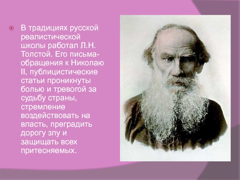 Слайд 12В традициях русской реалистической школы работал Л.Н. Толстой. Его письма-обращения к