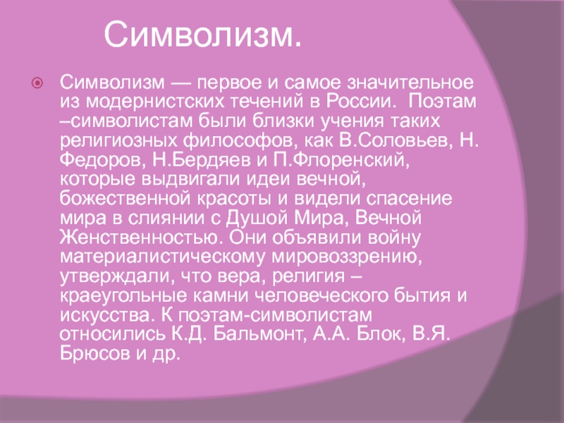 значительное из модернистских течений в России. Поэтам –символистам были близки учения таких религиозных философов, как В.Соловьев, Н.Федоров, Н.Бердяев и П.Флоренский, которые выдвигали идеи вечной, божественной красоты и видели спасение мира в слиянии с Душой Мира, Вечной Женственностью. Они объявили войну материалистическому мировоззрению, утверждали, что вера, религия – краеугольные камни человеческого бытия и искусства. К поэтам-символистам относились К.Д. Бальмонт, А.А. Блок, В.Я. Брюсов и др.