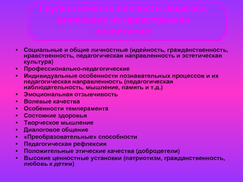 Группы качеств личности педагога, влияющие на нравственное воспитание:
