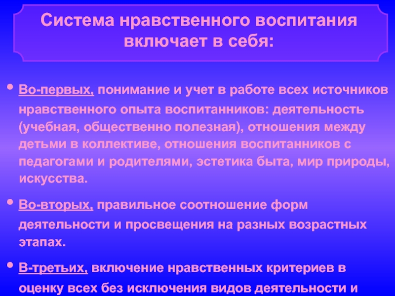Система нравственного воспитания включает в себя: