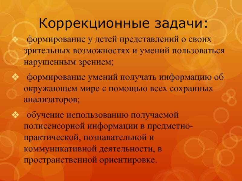 обучение использованию получаемой полисенсорной информации в предметно-практической, познавательной и коммуникативной деятельности, в пространственной ориентировке.