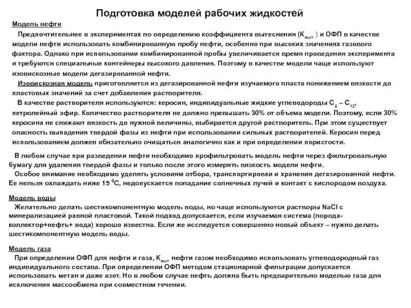 При определении ОФП для нефти и газа, Квыт нефти газом необходимо использовать углеводородный газ индивидуального состава. При определении ОФП методом стационарной фильтрации допускается использовать метан и даже азот. Но в любом случае нефть должна быть предварительно моделью газа для исключения массообмена при совместном течении.