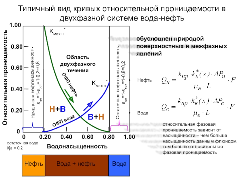 относительная фазовая проницаемость зависит от насыщенности – чем больше насыщенность данным флюидом, тем больше относительная фазовая проницаемость