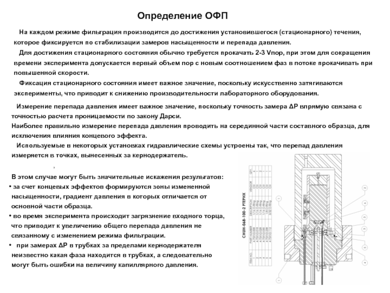 Непосредственно эксперимент по определению ОФП заключается в совместной фильтрации нефти и воды при различных соотношениях в потоке и постоянном суммарном расходе.