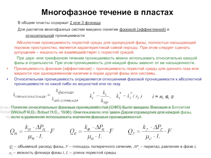 Понятие относительных фазовых проницаемостей (ОФП) было введено Виковым и Ботсетом (Wickoff R.D., Botset H.C., 1936). Они показали, что закон Дарси справедлив для каждой фазы, если в уравнении использовать значения фазовых проницаемостей.
