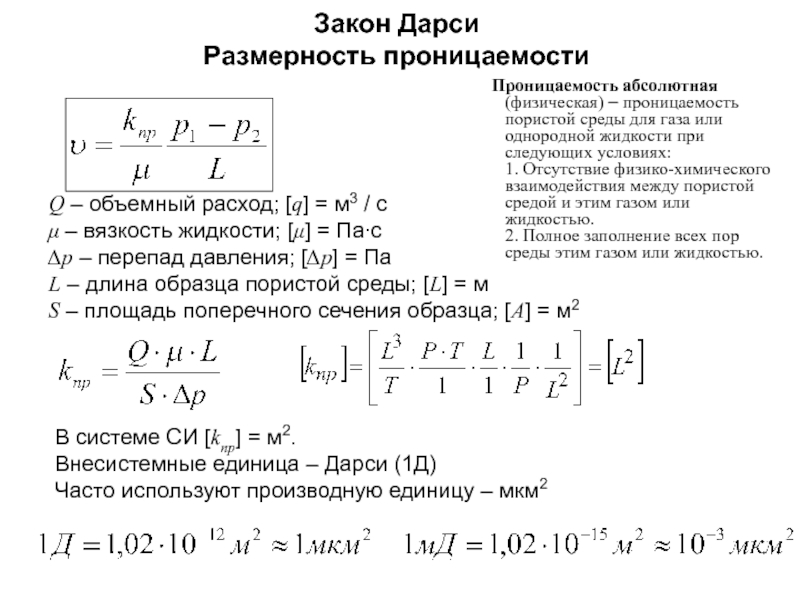Проницаемость абсолютная (физическая) – проницаемость пористой среды для газа или однородной жидкости при следующих условиях: