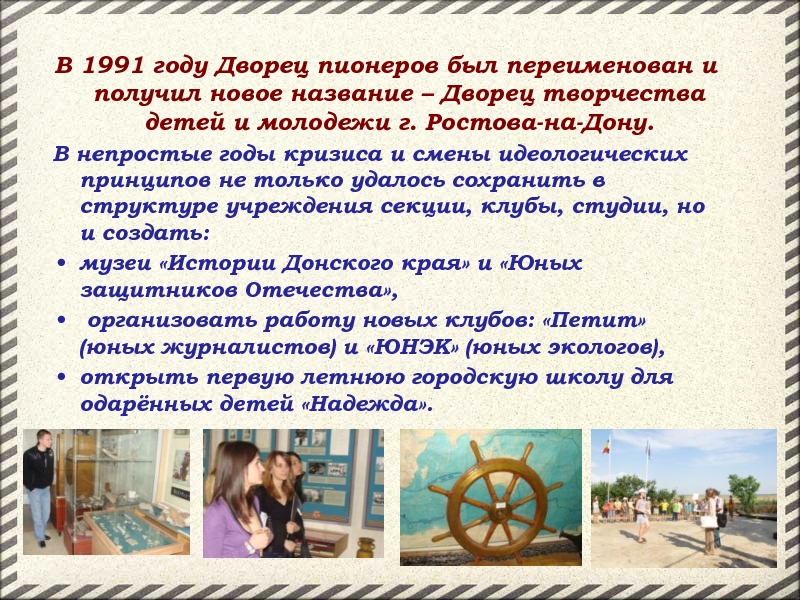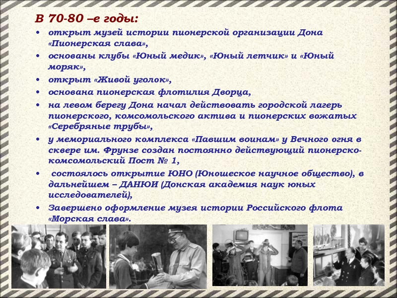 Два первых послевоенных десятилетия определили стратегию развития Дворца пионеров, который стал общегородским внешкольным культурно-образовательным учреждением и центром пионерской общественно-политической работы.