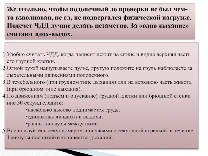 Наблюдение за дыханием необходимо проводить незаметно для пациента, так как он может непроизвольно изменить ЧДД, ритм, глубину дыхания.