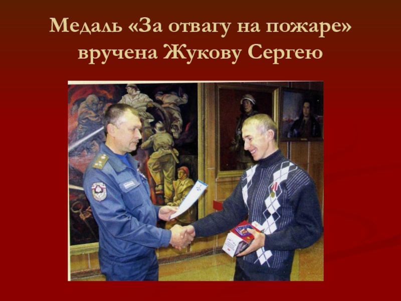 Слайд 13Медаль «За отвагу на пожаре» вручена Жукову Сергею