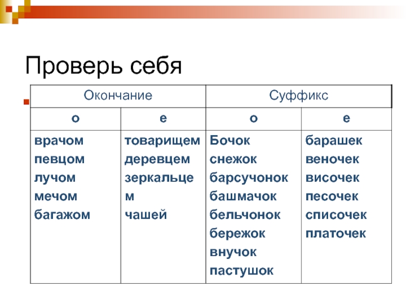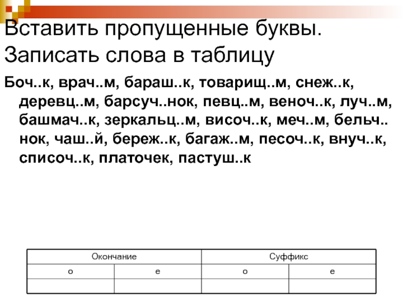 деревц..м, барсуч..нок, певц..м, веноч..к, луч..м, башмач..к, зеркальц..м, височ..к, меч..м, бельч..нок, чаш..й, береж..к, багаж..м, песоч..к, внуч..к, списоч..к, платочек, пастуш..к