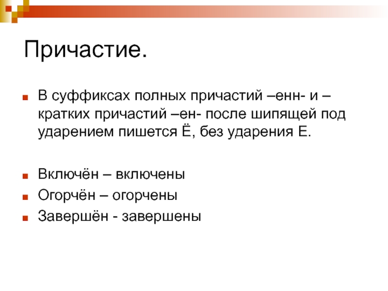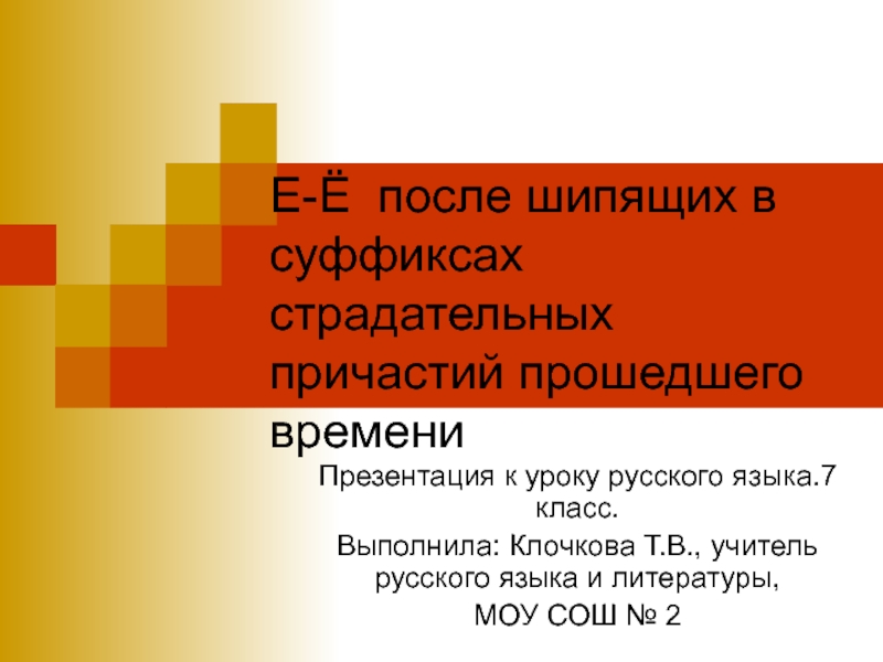 Слайд 1Е-Ё после шипящих в суффиксах страдательных причастий прошедшего времени